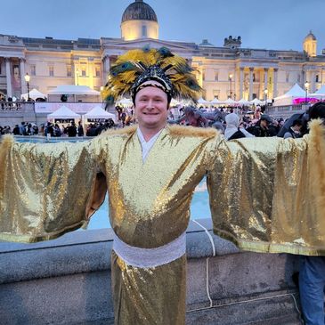 Created especially for a show at Japan Matsuri, London in 2024 this kimono is covered on gold sequins and tassels. LJ performed Matsuken Samba with the Naomi Suzuki Dancers.
